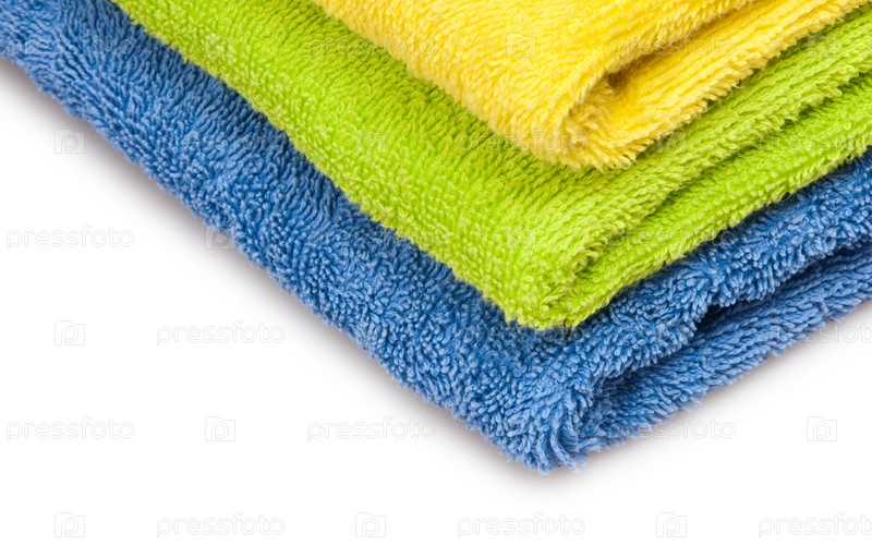 Три махровых полотенца лежат стопкой на белом фоне