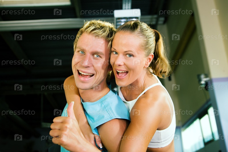 Мужчина и женщина радостно обнимаются в спорт-зале