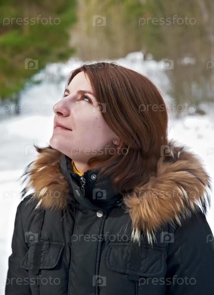 Красивая девушка в зимней куртке смотрит вверх
