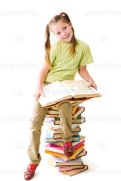 Портрет симпатичной школьницы, сидящей на вершине кучи с открытой книгой и смотрящей в камеру