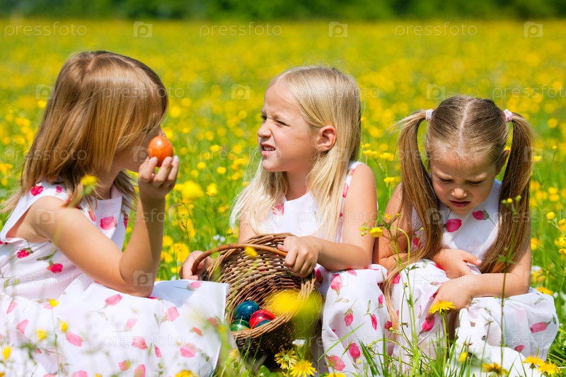 Маленькие девочки сидят в поле с корзинкой с пасхальными яйцами