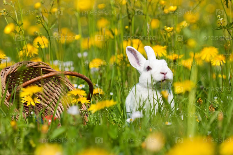 Белый пасхальный кролик сидит у корзины с крашенными яйцами