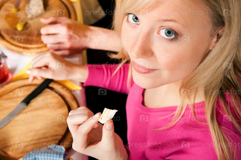 Молодая девушка обедает в кафе