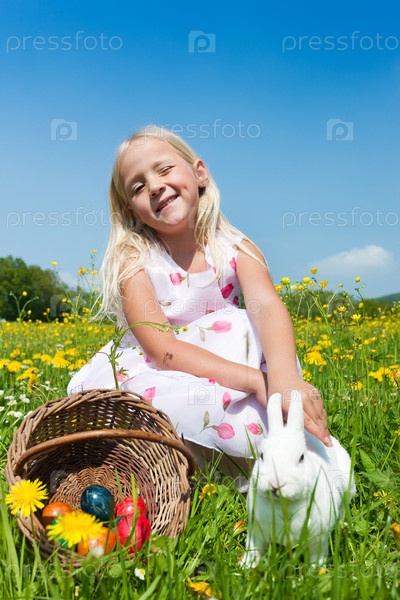 Маленькая девочка с белым пасхальным кроликом сидит у корзины с крашенными яйцами