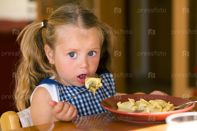Маленькая девочка ест пельмени