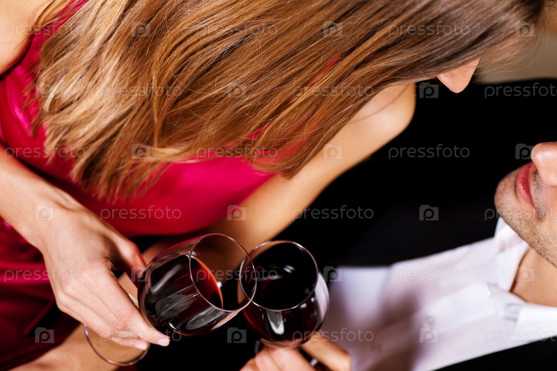 Бокалы красного вина в руках влюбленной пары
