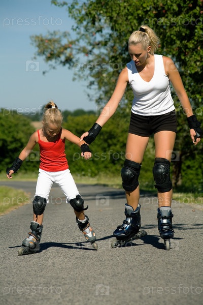 Мать катается на роликах с дочерью