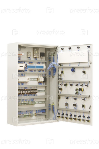 Серый электро распределительный шкаф, на белом фоне