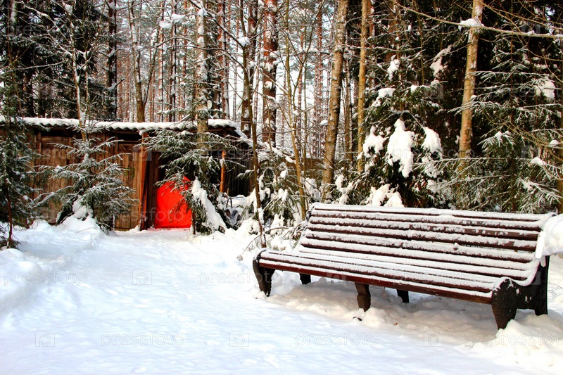 Скамейка в заснеженном лесу