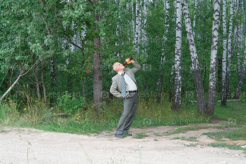 Пожилой мужчина выпивает в лесу