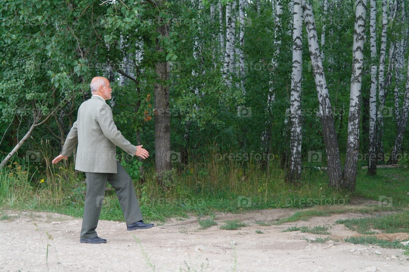 Пожилой мужчина в деловом костюме идет в лес
