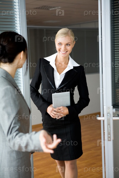 Красивая женщина стоит у двери и общается с коллегой
