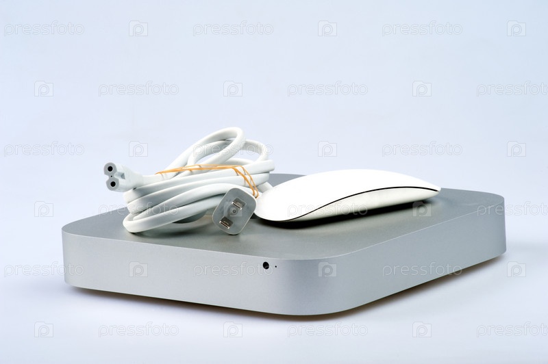 Компьютер Мак мини с сетевым кабелем и мышью