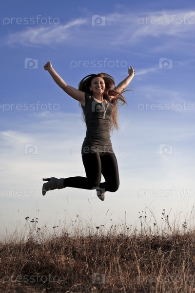 Красивая девушка прыгает на фоне неба