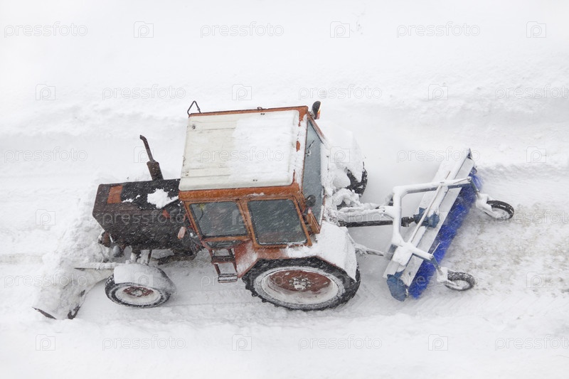 Трактор чистит улицу в сильный снегопад