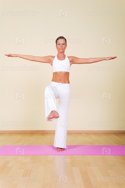Девушка делает упражнение на равновесие на коврике