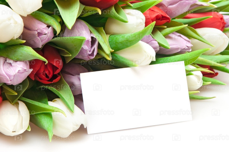 Букет тюльпанов с пустой белой карточкой лежит на белом фоне