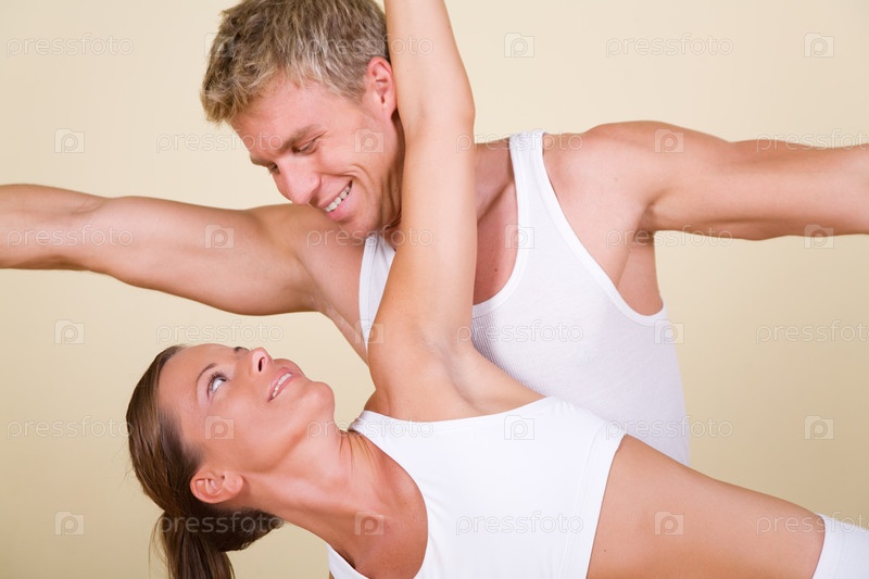 Девушка и молодой человек делают упражнения в паре