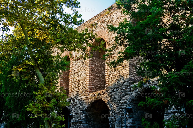 Руины старого акведука среди зеленых деревьев, Стамбул, Турция