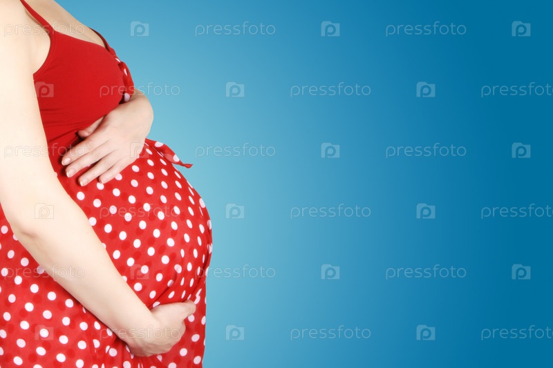 Беременная женщина в красном платье на голубом фоне