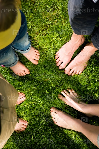 Босые люди стоят на траве