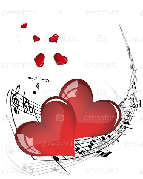 Абстрактный фон с красными объемными сердцами на нотах