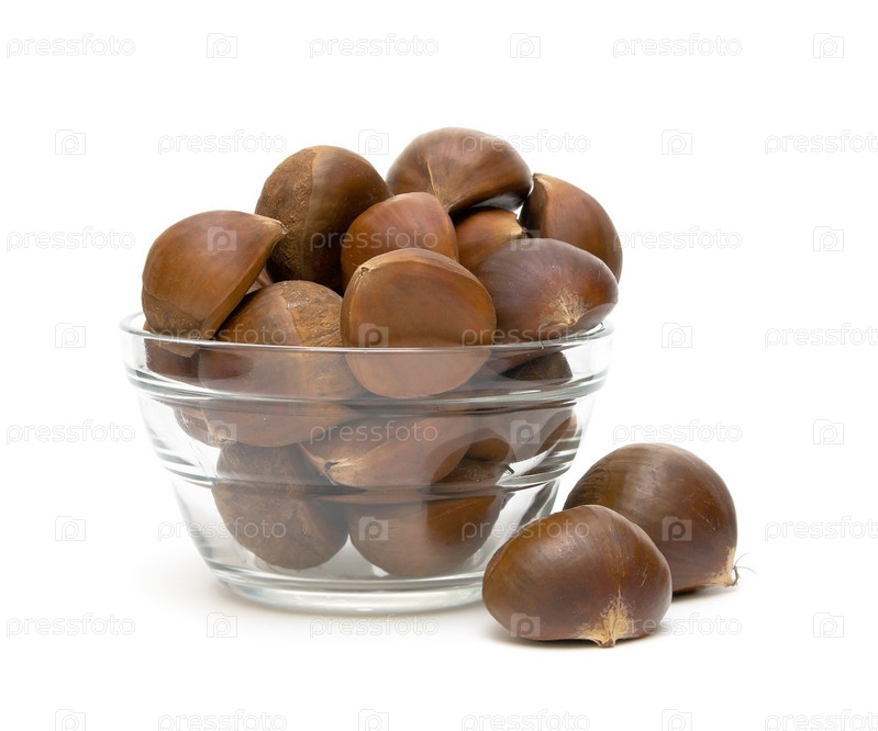 Сладкие каштаны в стеклянной миске на белом фоне