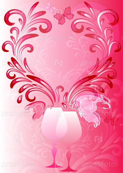 Романтическая иллюстрация с бокалами, бабочками и цветочным узором в форме сердца