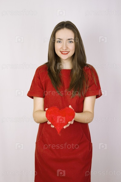 Молодая девушка с красным сердечком на сером фоне