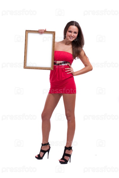 Девушка в коротком розовом платье с рамкой в руках