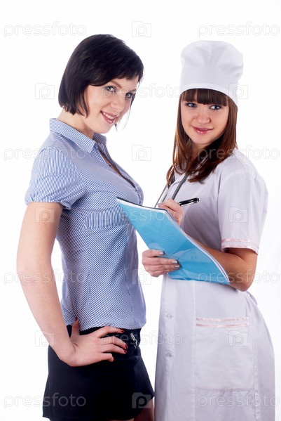 Молодая женщина-врач и пациент на белом фоне