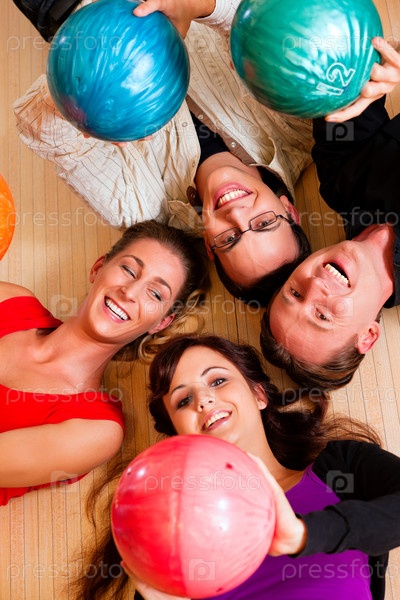 Друзья с шарами для боулинга лежат на полу