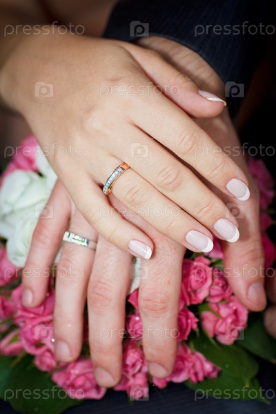 Руки жениха и невесты на свадебном букете