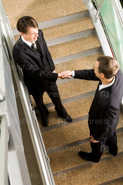 Вид сверху рукопожатия двух бизнесменов, стоящих на лестнице