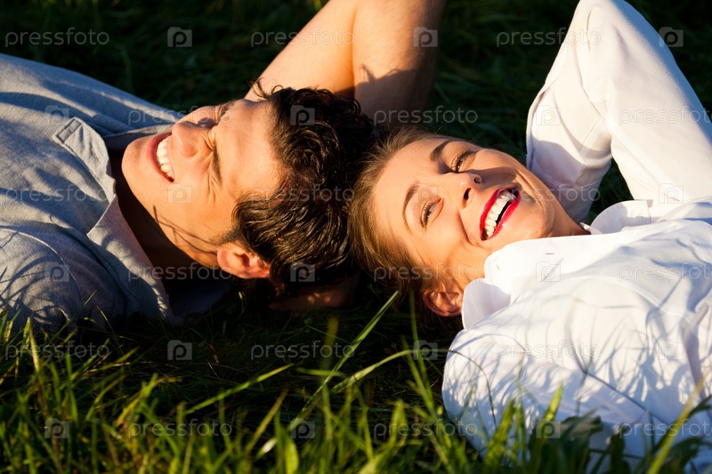 Счастливая молодая пара лежит на траве