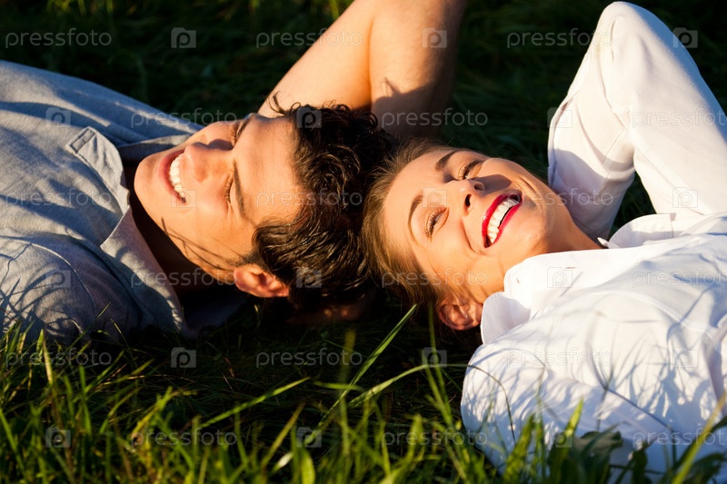 Счастливая молодая пара лежит на траве