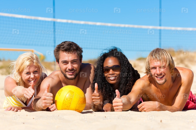 Друзья лежат на пляже с волейбольным мячом