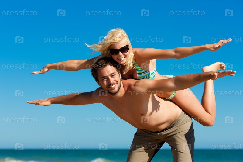 Счастливая пара на море во время медового месяца