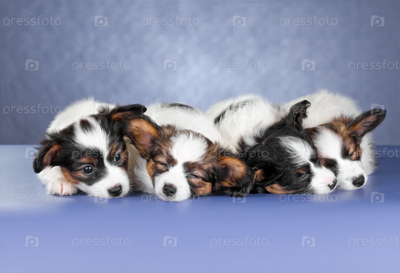 Четыре щенка папильона на синем фоне