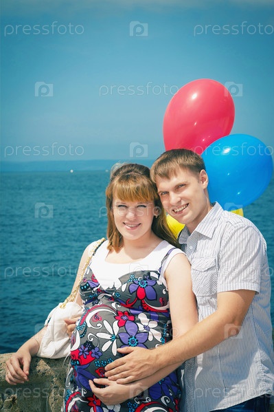 Портрет беременной женщины с мужем на море