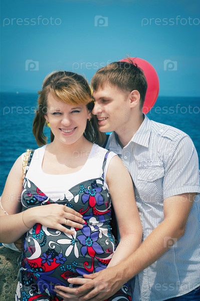 Портрет беременной женщины с мужем на море