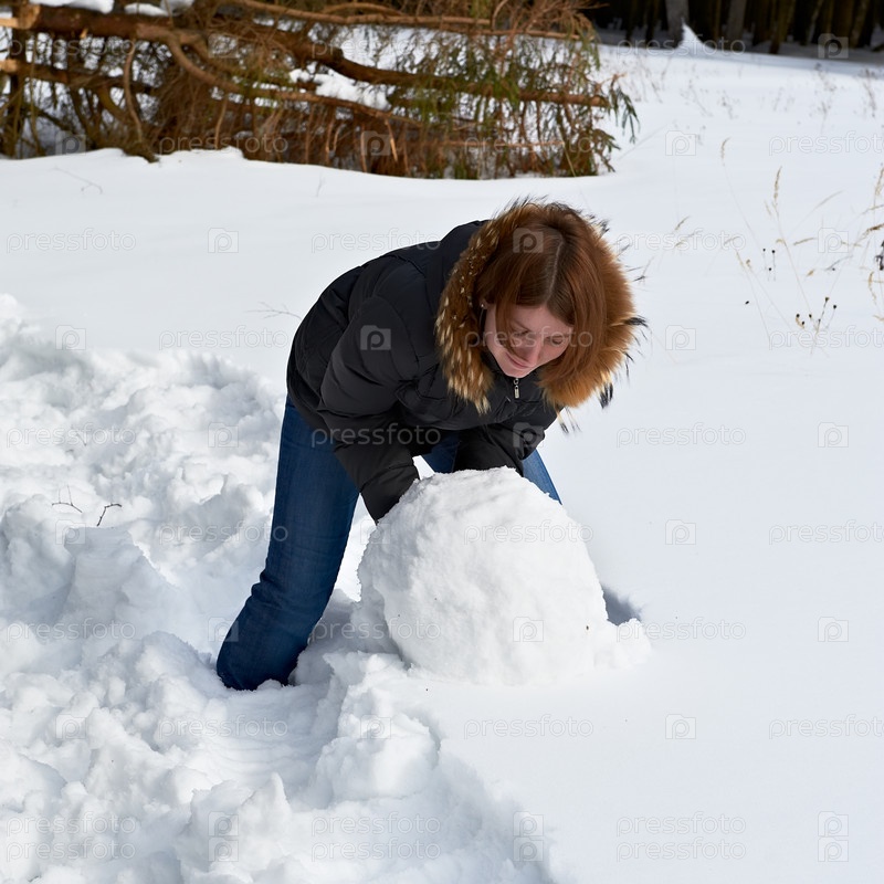 Девушка делает снеговика в лесу