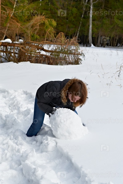 Девушка делает снеговика в лесу