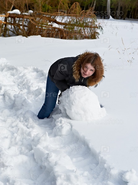 Девушка делает снеговика в лесу