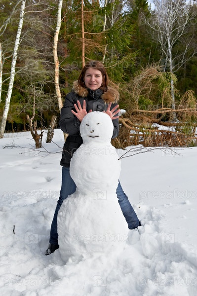Девушка и снеговик в лесу