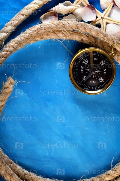 Морские ракушки,льняная крученая веревка и компас на синем фоне