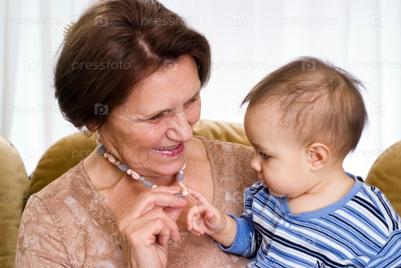 Пожилая женщина держит на руках маленького ребенка
