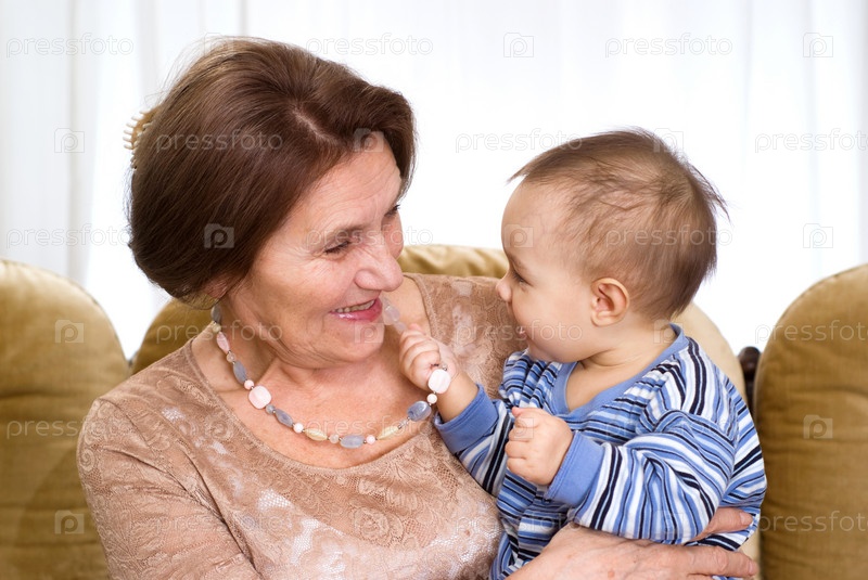 Пожилая женщина держит на руках маленького ребенка