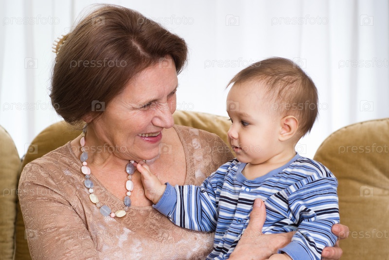 Пожилая женщина держит на руках маленького ребенка