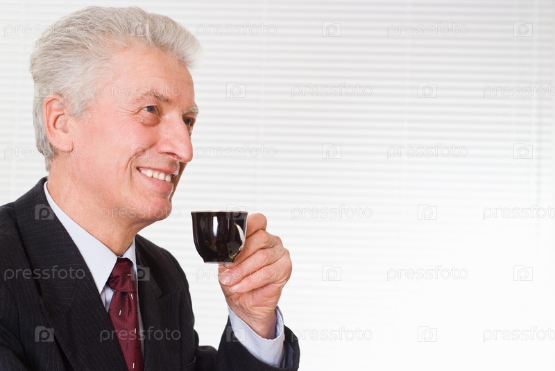 Портрет улыбающегося пожилого бизнесмена с кофейной чашкой в руке